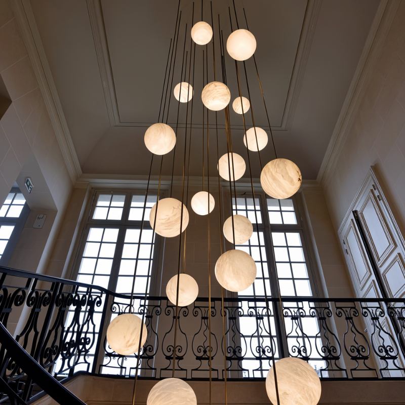 Absolutely, the Crepe Chandelier is conceived as a sculptural focal point. Its architectural linear and spherical design, enhanced by the sophisticated alabaster and metal construction, creates a commanding centerpiece that captivates attention in any environment. The chandelier's adaptability in scale, quantity, and adjustable suspension lengths enables artistic arrangements, ensuring seamless integration across contemporary and traditional interiors while maintaining its enduring sophistication.